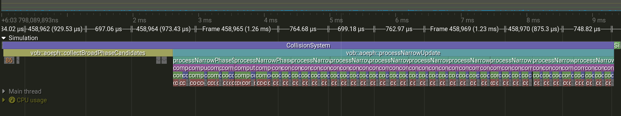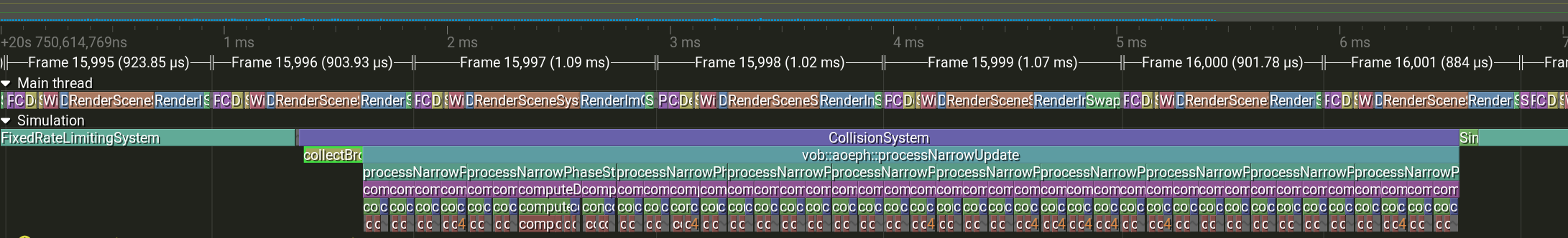 Roughly, broad phase would take up to 2ms and narrow phase could take 1.5ms per sub-step with a total of up to 18ms where the map had a decent amount of colliding triangles. Reminder: physics must run below 10ms per update. Here is what a typical profile was: