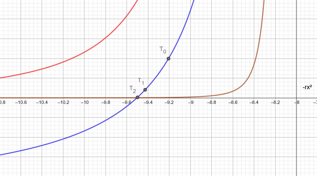 To start with, for tmin, the monotony of f (f'(t) > 0) and strict positivity of f" in ]-Inf, -rx²[ means that we can apply Newton's method in a way that is guaranteed to converge safely (stays in that interval) and rather quickly (this is orders of magnitude faster than the dichotomy method) for any starting point t such that f(t) > 0:
