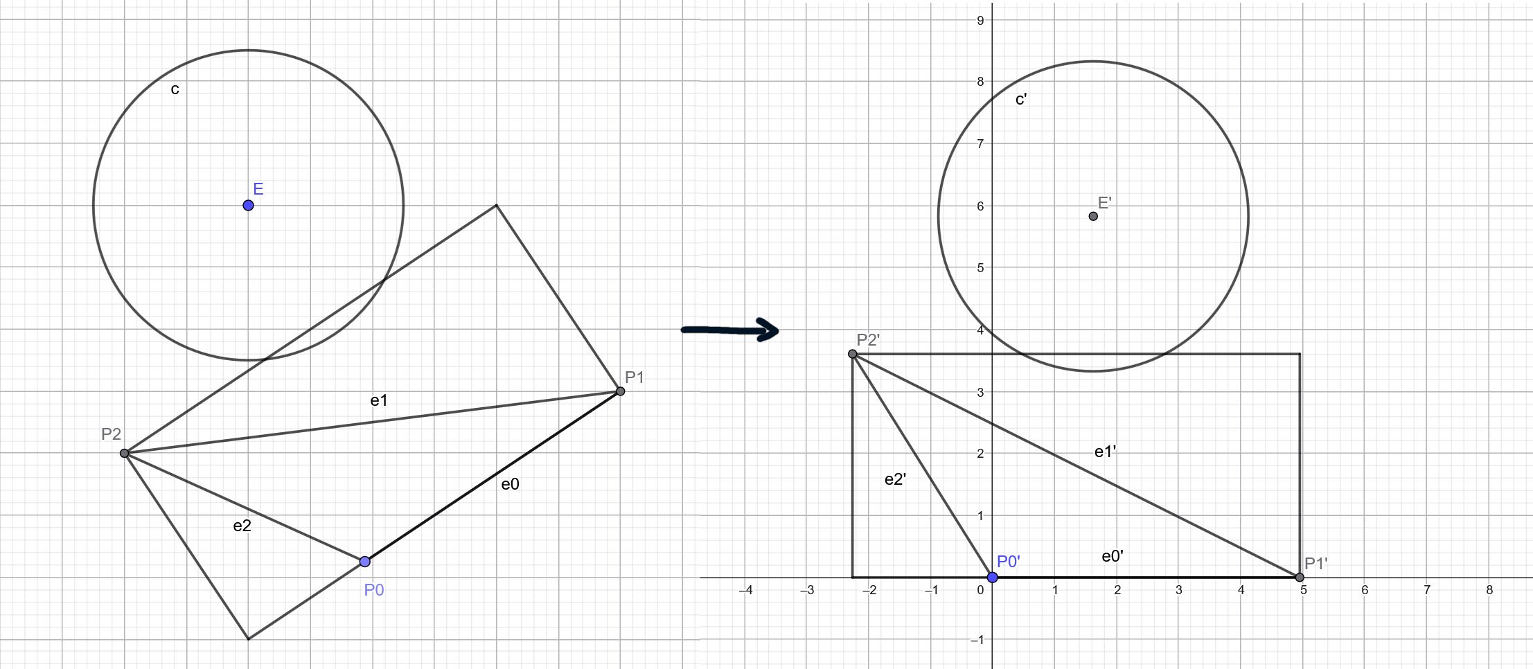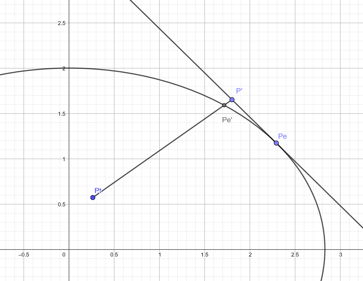 Last week we saw how given a point Pt (belonging to a triangle) inside an ellipsoid E, the closest point Pe on ellipsoid surface must satisfy that dir(Pt, Pe) is the normal of ellipsoid at Pe. If it was not the case, it means we could do a small step on plane (Pe, n) while still outside (since this plane is tangent to the convex ellipsoid shape at Pe) and projecting this new point P' on ellipsoid would give another point Pe' that is closer to Pt than Pe is.