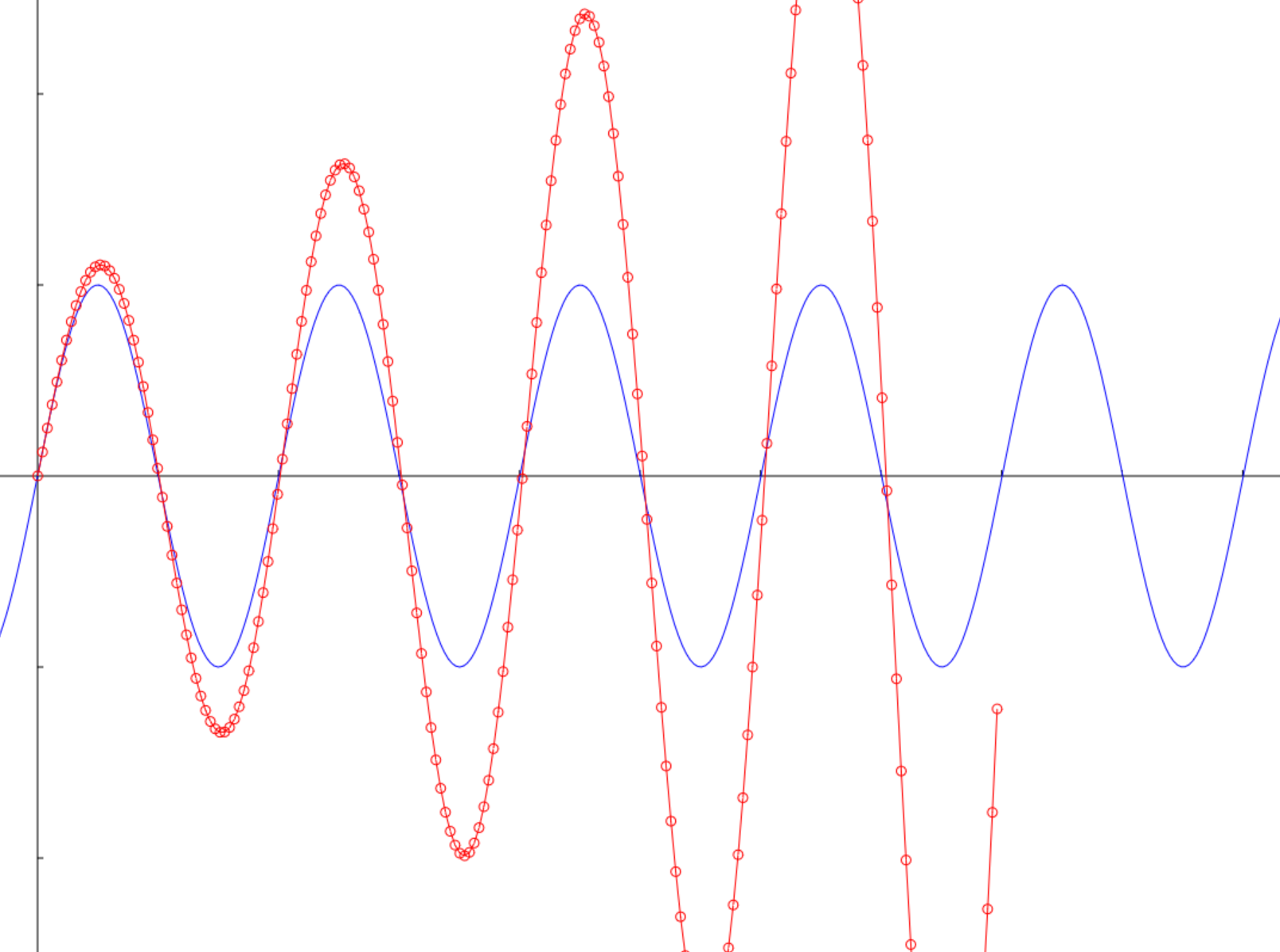 This method is off course highly dependent on chosen deltatime since Fn is assumed constant for the duration of the iteration. However, for the type of extreme oscillating forces I am dealing with, this assumption makes the physics unstable: the same collision at same speed would sometimes bounce a lot and sometimes less depending on when iterations occurred during penetration. Off course I could decrease my deltatime from an already-low 1/1000th of a second, but this comes at a cost (evaluating the collision function is not trivial since it needs to find in the world what surfaces the car collides with). Here is an example of this Euler's drift for a simple Harmonic Oscillator (un-dampened spring):