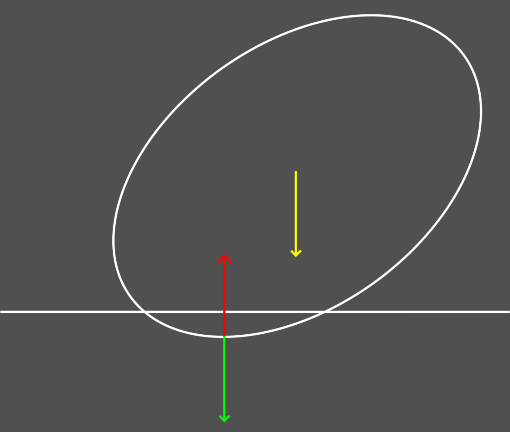 After a few more frames/steps, ellipsoid has bounced back (this depends on damping coefficient c seen above, the greater it is the less ellipsoid bounces back) and now has a lateral momentum. Try picturing a rubber rugby ball falling on the ground to convince yourself this is a model that can yield believable results. Here is an older video of mine showing what it can look like with a simple ellipsoid:
