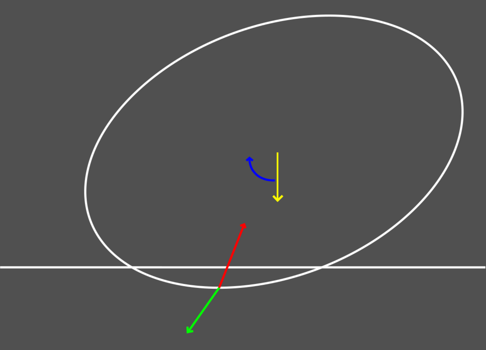 In first frame, imagine an ellipsoid with a downward velocity (in yellow) that has just penetrated the triangle (represented by the horizontal line). Let's imagine this system is a compressed suspension modelled by the classic dampened spring formula F = -k·x -c·vn where x is the pentration distance and vn the relative velocity of our ellipsoid at point of contact along the triangle's normal. Since the ellipsoid is not rotating, the velocity at point of contact (in green) is the same as the ellipsoid center's velocity. This also means there is no lateral velocity at point of contact, so no friction to account for this frame. Applying this force (in red) will push the ellipsoid back vertically and induce a rotation based on the lever arm from point of contact to center.