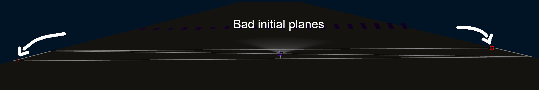 Using separating planes instead of AABB hopefully (there is still some WIP) gives me better performances in non axis-aligned sections of a map like a tight turn: this allows, in theory, finding this diagonal plane that would better split triangles in two separated groups. However in practice it is almost impossible finding the perfect plane, here is the algorithm I went for: