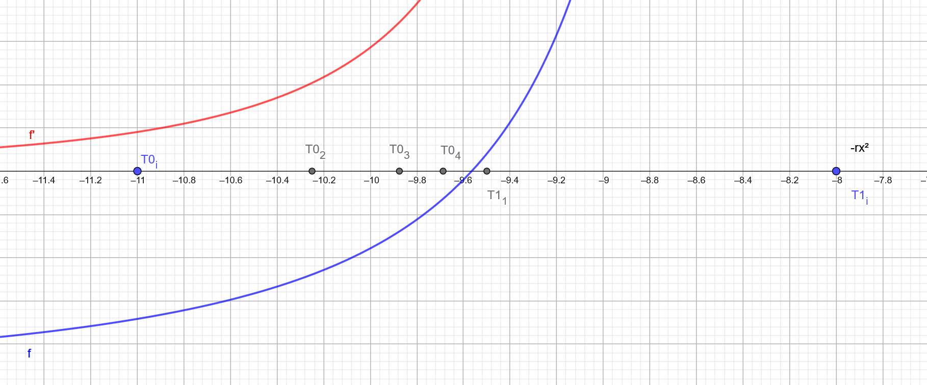 In addition, there may exist 2 additional roots in ]-rx², -ry²[ and 2 other in ]-ry², -rz²[ but this may not always be the case (see graph below). Since f" is strictly positive between an interval such as ]-rx², -ry²[ while f goes to +Inf at those two asymptots, the presence of the 2 roots depends on whether f manages to go negative within the interval. A good way to know if those roots exist it is to find the root tlow of f' in this interval (here where red curves crosses the X axis) which gives the lowest point of f. If f(tlow) is negative, we have 2 additional roots for f, one in ]-rx², tlow[ and one in ]tlow, -ry²[.